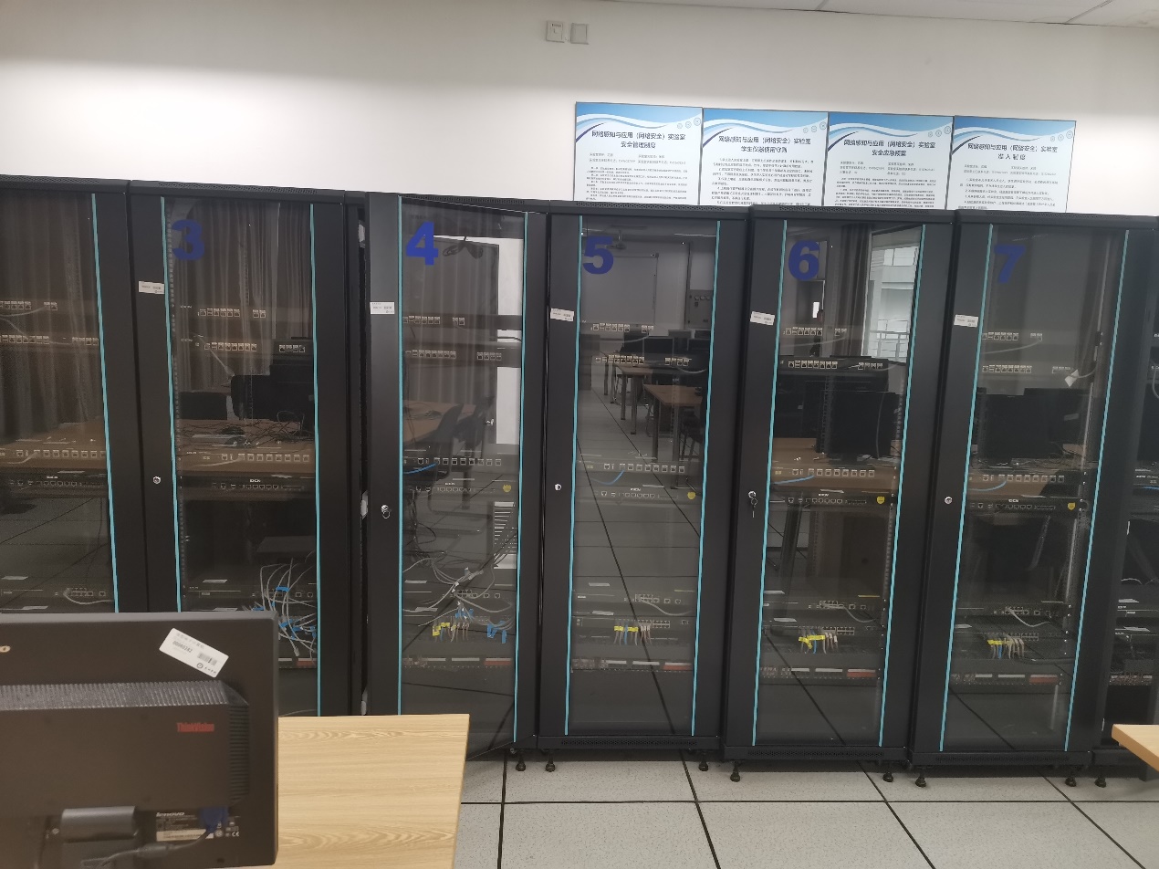 网络感知与应用(网络安全)实验室(B1403),建于2014年,占地133m2,有二层交换机、流控及审计设备、入侵检测和防御系统、网页防护系统、虚拟专网VPN、云虚拟试验平台,共八组实验设备,可容纳48个人同时完成实验。
