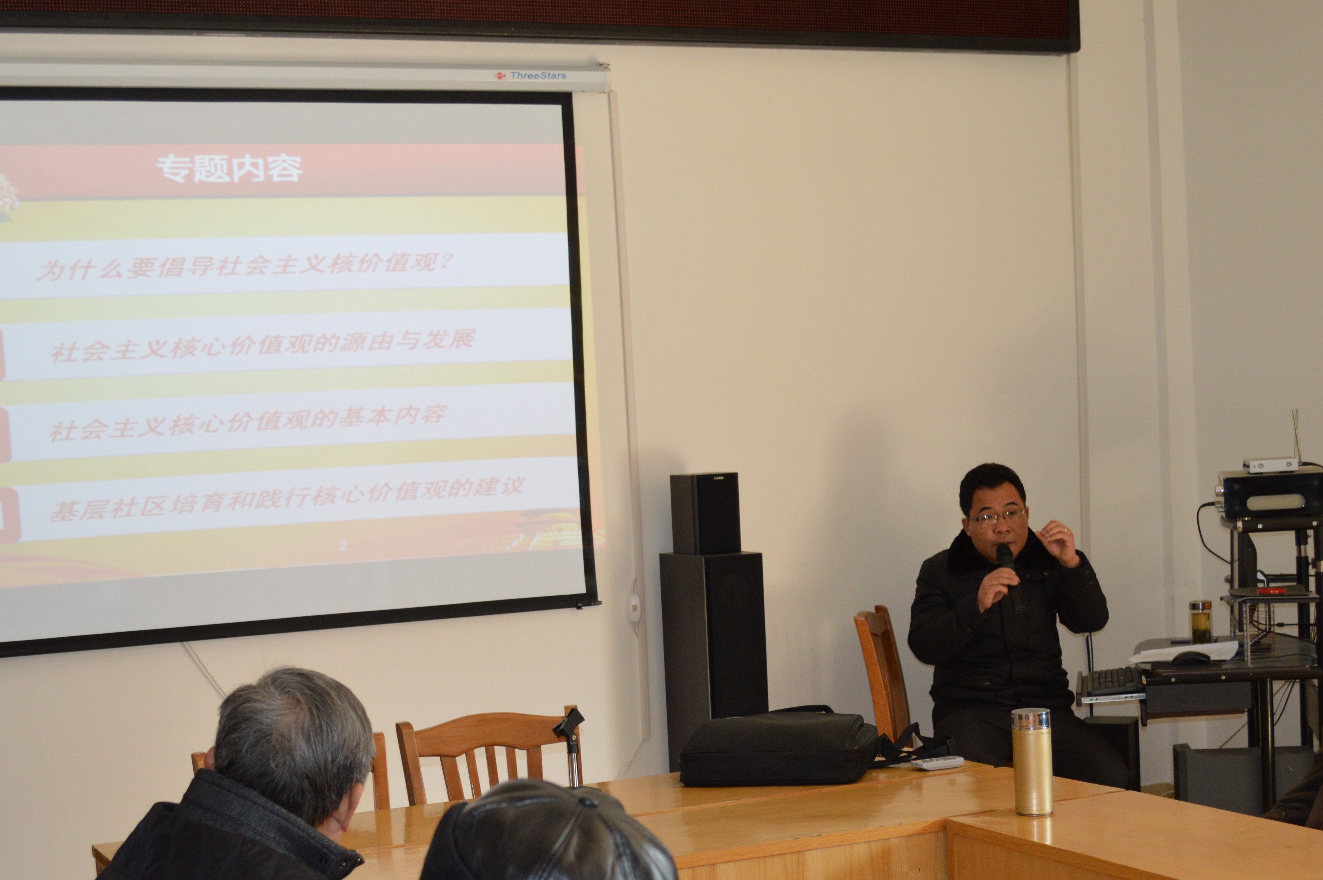 2015年2月8日公司党总支副书记陈茂国老师受邀参加了“理论故事大家讲”主体宣讲活动,为城南街道滨江社区党员冬训班的党员们作了“践行社会主义核心价值观、助力实现中国梦”的专题讲座。