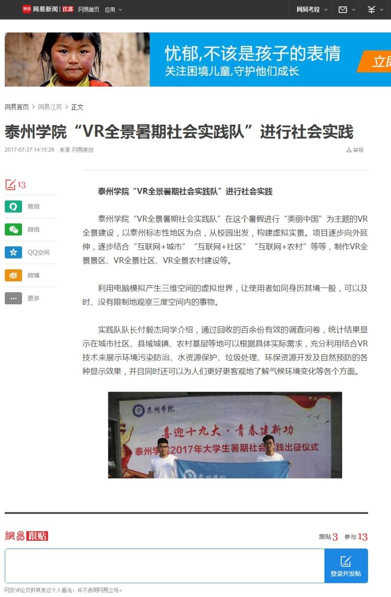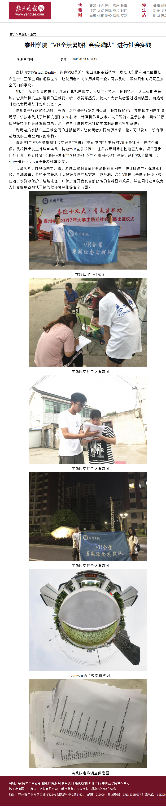 伟德国际bevictor1946“VR全景暑期社会实践队”将进行“美丽中国”为主题的VR全景建设,在这个暑假,从校园出发进行试点实践,构建“VR全景校园”。往后以泰州标志性地区为点,项目逐步向外延伸,逐步结合“互联网+城市”“互联网+社区”“互联网+农村”等等,制作VR全景城市、VR全景社区、VR全景农村建设等。