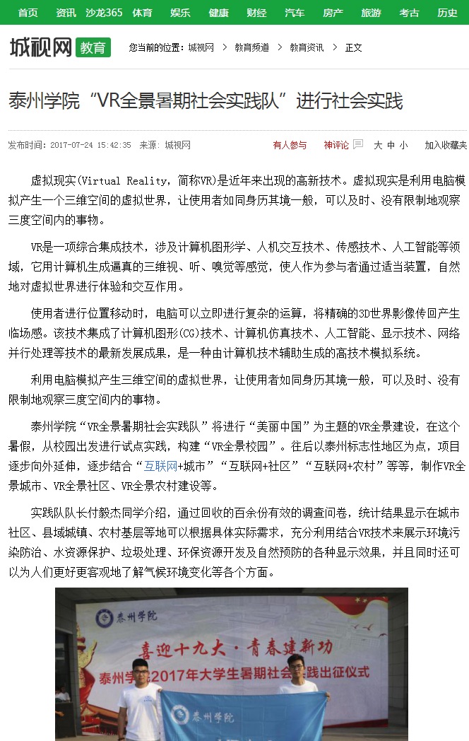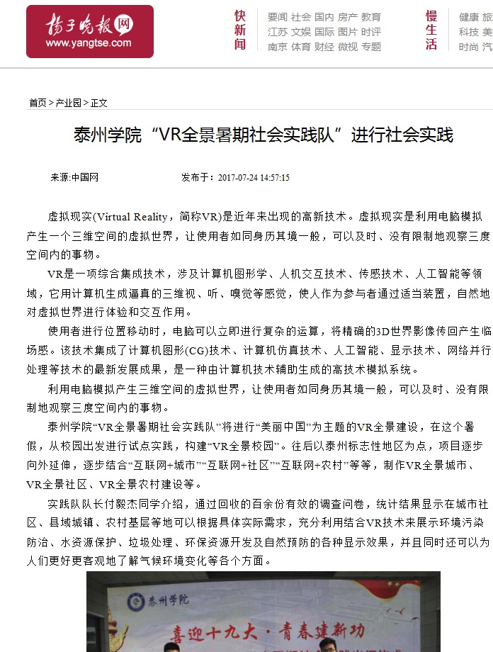 伟德国际bevictor1946“VR全景暑期社会实践队”将进行“美丽中国”为主题的VR全景建设,在这个暑假,从校园出发进行试点实践,构建“VR全景校园”。往后以泰州标志性地区为点,项目逐步向外延伸,逐步结合“互联网+城市”“互联网+社区”“互联网+农村”等等,制作VR全景城市、VR全景社区、VR全景农村建设等。