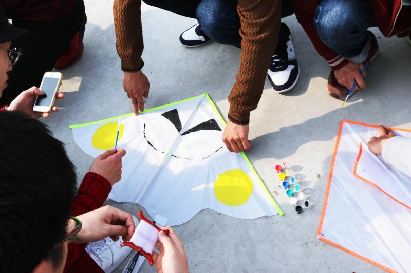 本次活动由风筝制作与风筝放飞两个环节组成。每一个创作团队成员相互配合,相互协调,分工井然。雪白的风筝画纸在同学们手上变得灵巧又美丽。样式新颖、各具特色的风筝逐渐成型。在风筝制作完成后,同学们在美丽的风筝上写上了各自的理想宣言放飞。现场评委根据造型、色彩、精致程度和风筝放飞的留空时间进行打分,评选奖项。同学们都全身心投入,整个校园天空上千姿百态,五颜六色的风筝,争齐斗艳,愉悦的氛围弥漫了操场。
