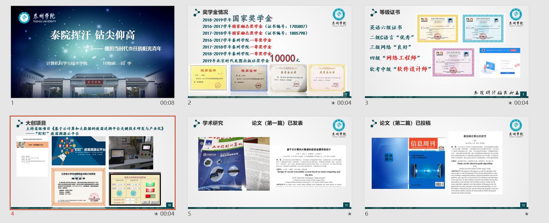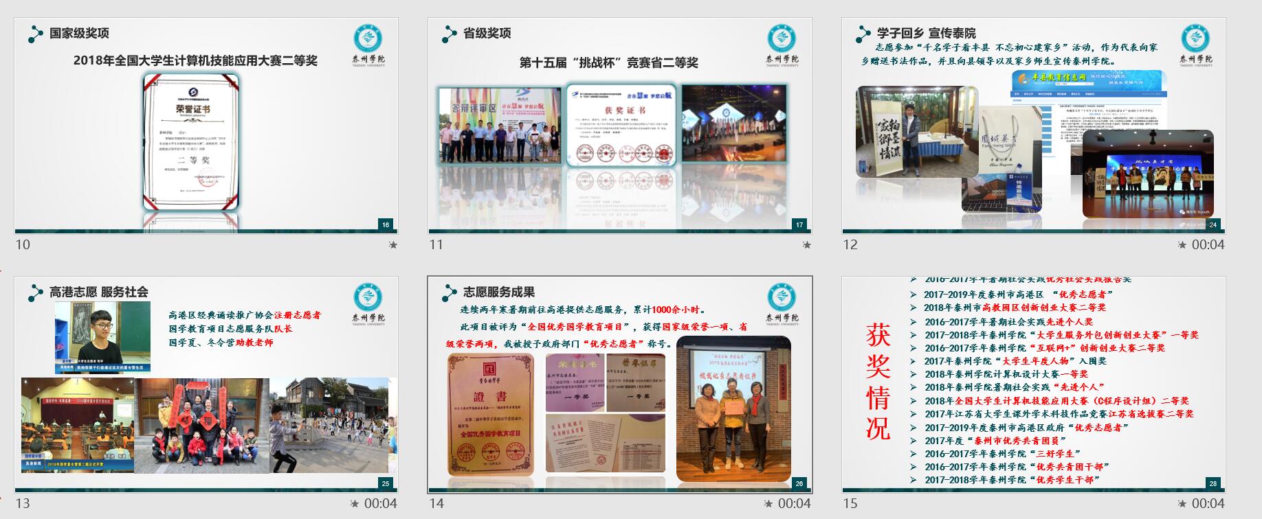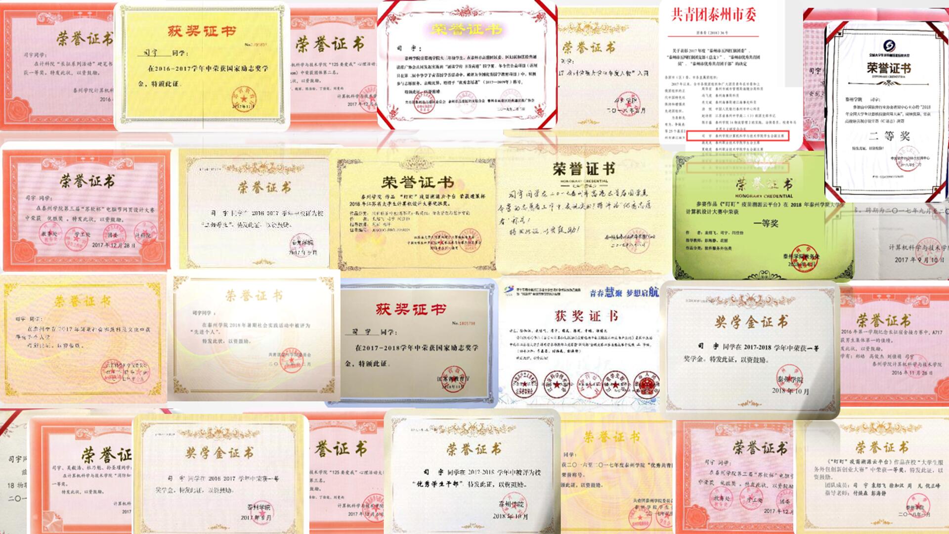 泰院四年,是我追梦的四年、是我奉献的四年,是我奋进的四年。四年来,我获得国家级荣誉4项,省级荣誉5项,市级荣誉4项,校级荣誉20余项,院级荣誉若干。以上的荣誉都已经过去,在新长征路上,我将做一名热爱祖国,有远大理想、有过硬本领,能砥砺奋斗、能担当时代责任的阳光青年。