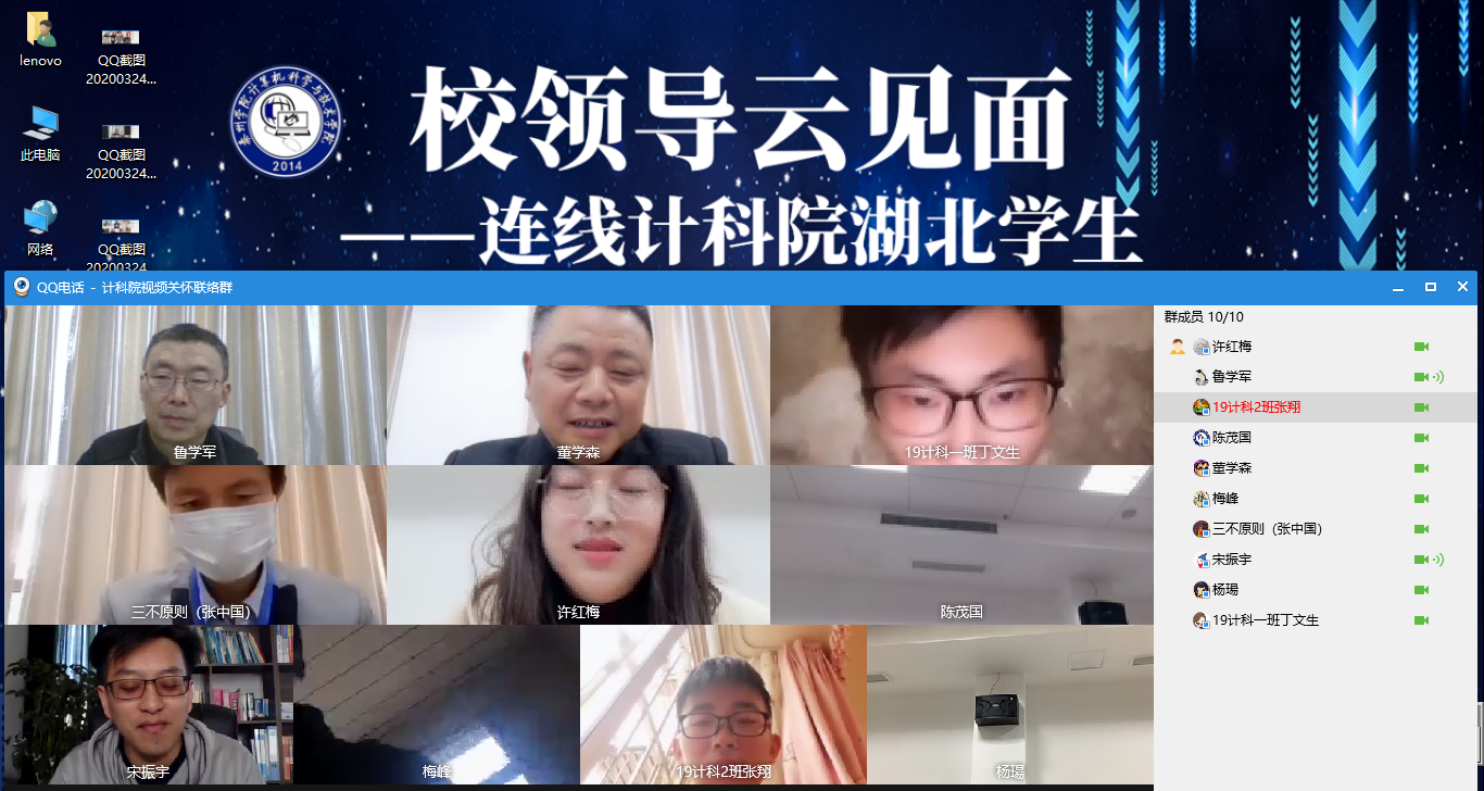 随着新冠肺炎疫情形势持续向好,但身处湖北疫区的同学们的健康和安全一直牵动着全校师生的心。3月24日上午,公司党委常委,副董事长鲁学军在行政楼会议室D2109视频连线计算机科学与技术公司滞留湖北的两位同学。会议由计科公司党总支书记董学森主持,计科公司党政领导,辅导员和班主任老师参加了“云见面”视频座谈。