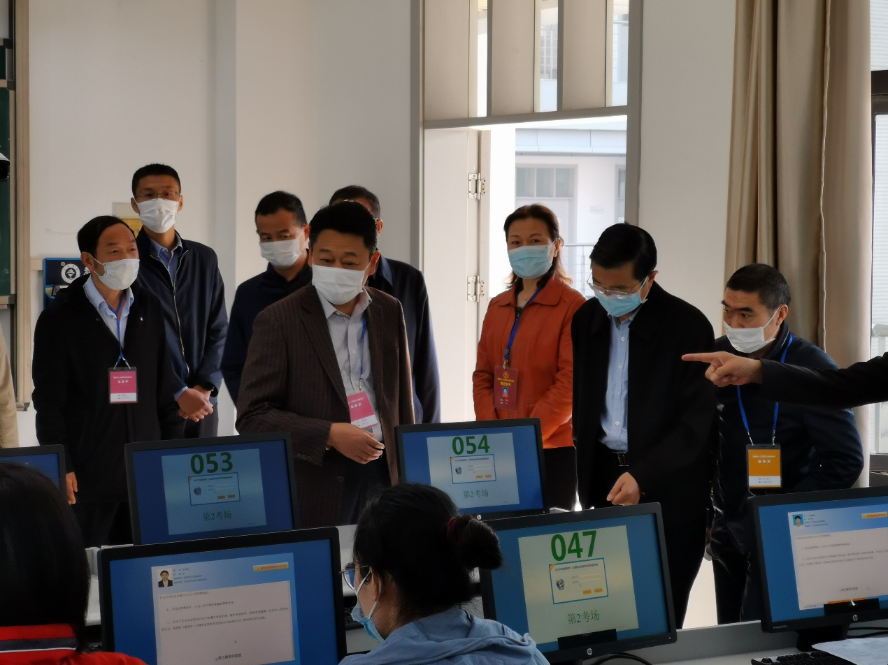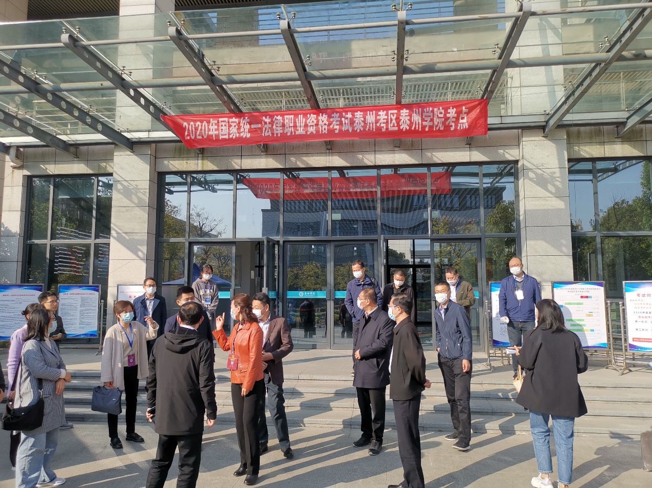 2020年10月31日上午,2020年国家统一法律职业资格考试泰州考区伟德国际bevictor1946考点考务工作在公司顺利进行,江苏省司法厅副厅长周福莲、江苏省泰州市委常委、政法委书记孔德平、泰州市司法局党组书记、局长孔德峰、泰州公司党委副书记邓友祥、考点总监考丁晴远、考点负责人袁建华、考点负责人李蓉、计算机科学与技术公司党总支书记董学森书记、考点副总监考钱进等人一行视察了考务情况。
