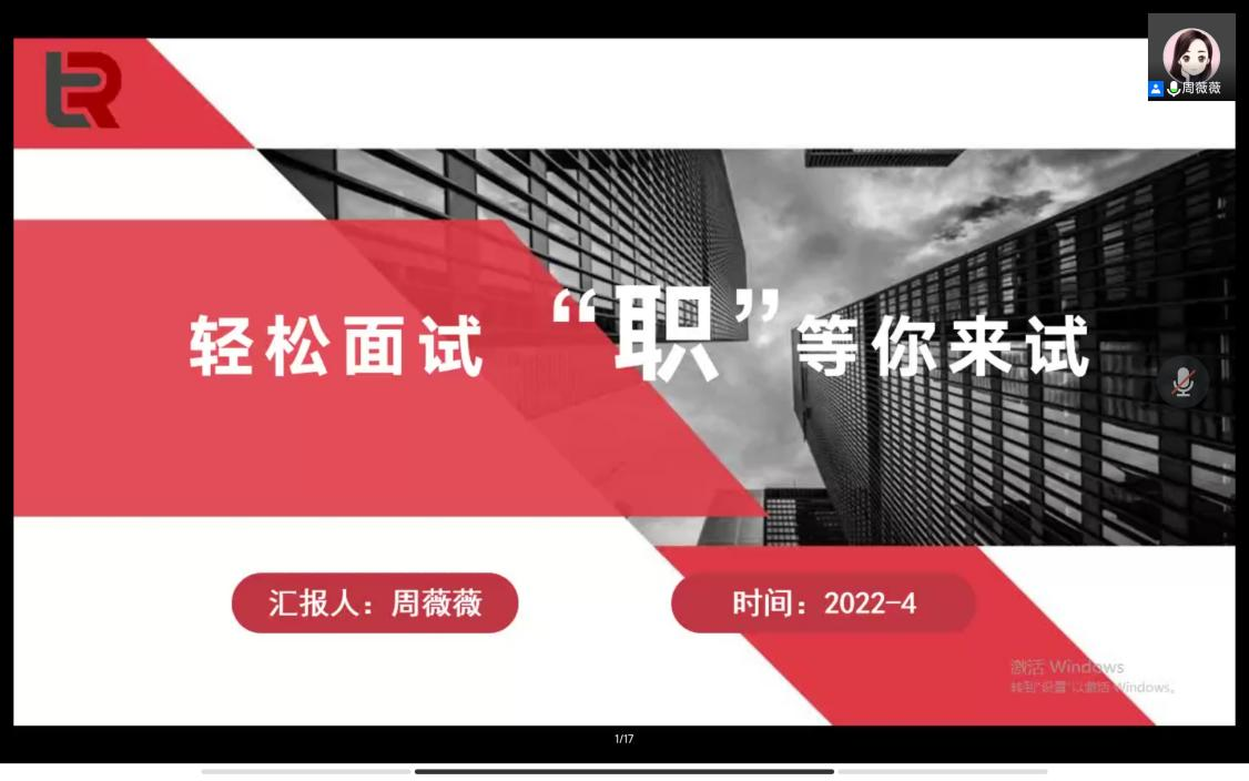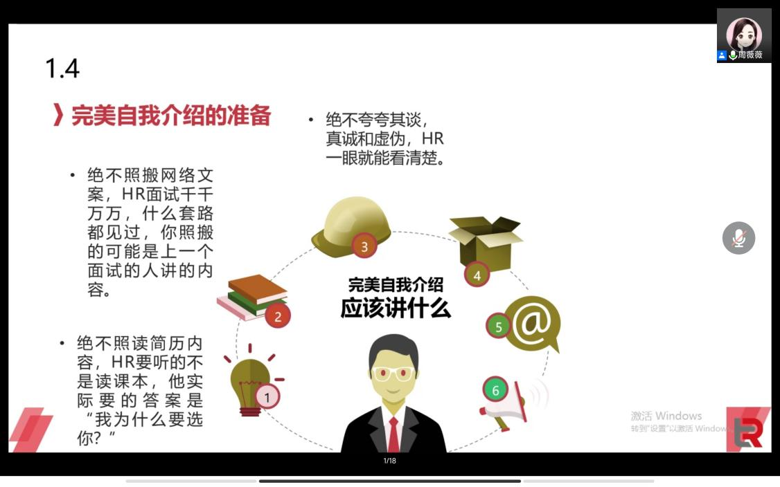 周薇薇首先从面试准备和时间观念上展开,指出面试时一定要充分了解即将竞聘的岗位,制定详细的说明书和好的简历。其次要讲究面试礼仪,做到衣着得体,谈吐方面大方坦然。最后向同学们透露了一些通关小技巧:一是做好工作计划,二是抓住自己的亮点,三是与企业HR保持紧密联系;四是不要起争论,五是认真聆听。讲座后同学们在线上积极地与周经理互动讨论,她再三强调一定要抓住自身优势并充分展示出来,这样才能让招聘单位HR眼前一亮。