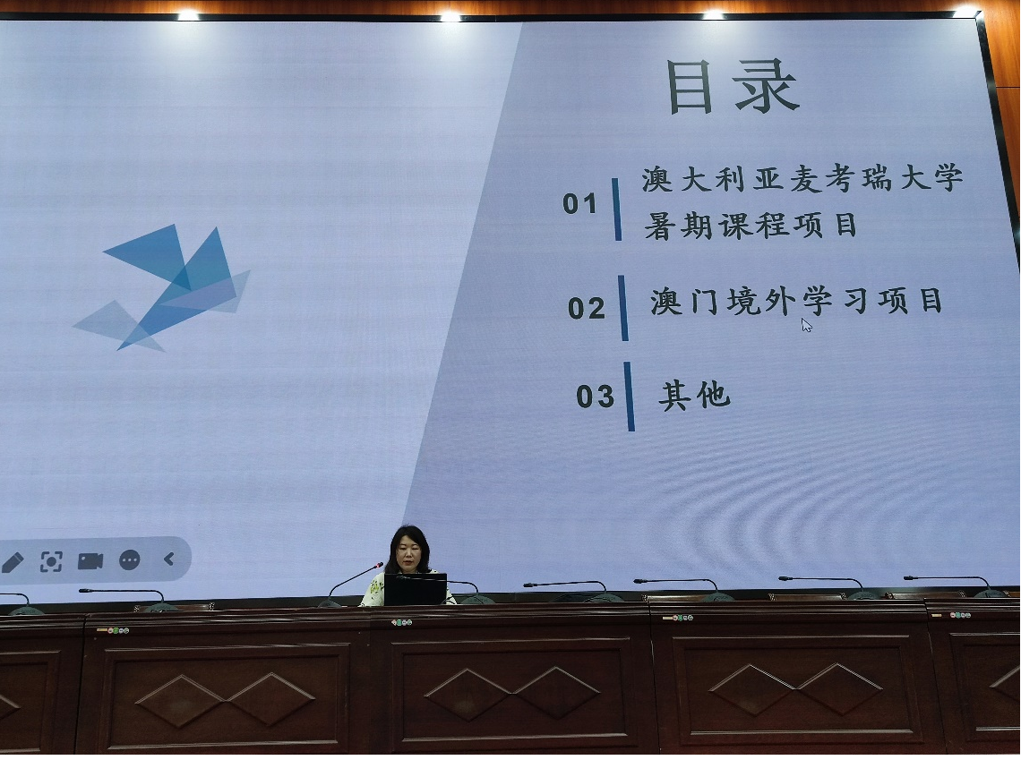 丁红霞老师介绍了澳大利亚麦考瑞大学暑期课程项目、澳门城市大学人工智能课程项目和澳门科技大学交流生项目等境外交流项目,展示了公司在国际合作和人才培养上取得的成绩,对员工如何申请此类合作项目给出了指导和建议。