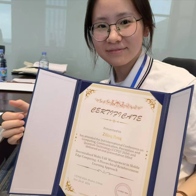 2024年10月25日至27日,伟德国际bevictor1946大三员工彭紫凌同学在珠海参加了第三届计算、通信、感知与量子技术国际会议(CCPQT 2024),全英文宣讲了学术论文,并与众多学者就移动边缘计算相关学术问题进行了科学研讨。