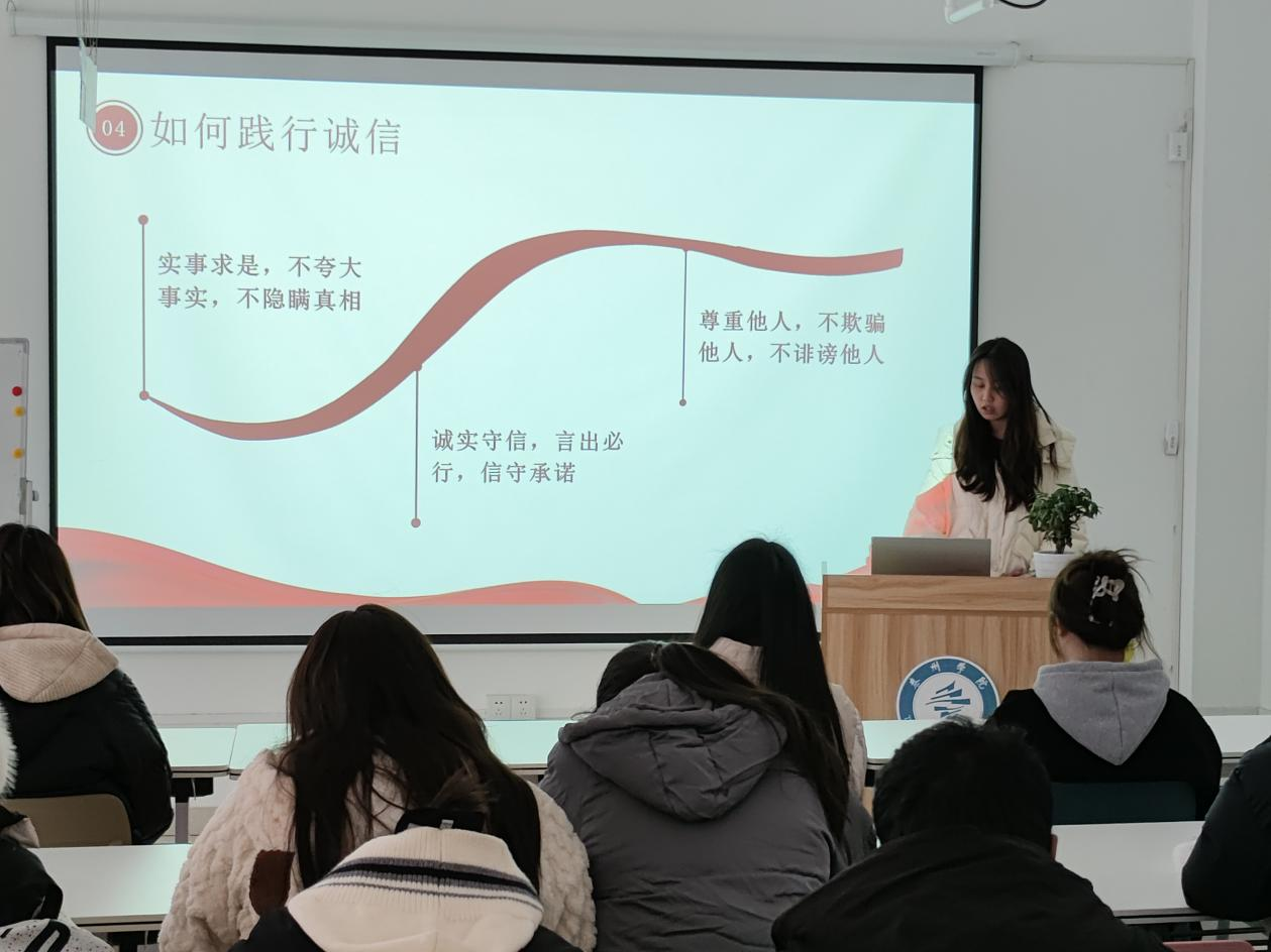 徐静冉结合党史讲述了老一辈共产党员在战争年代仍然坚守诚信,从而赢得民心的故事;王倩从个人成长经历出发,阐述了老员工应该如何践行“诚守初心”;王易婷、孟昕玥诠释了何为诚信,为何诚信以及怎样发挥老员工自身的道德表率作用,从而使诚信美德在全社会蔚然成风。同时,四名员工党员结合校园生活实际,列举了学术造假、骗取助学金等不诚信反面案例,深刻剖析了这些行为带来的严重后果,引导员工们引以为戒,自觉坚守诚信底线。