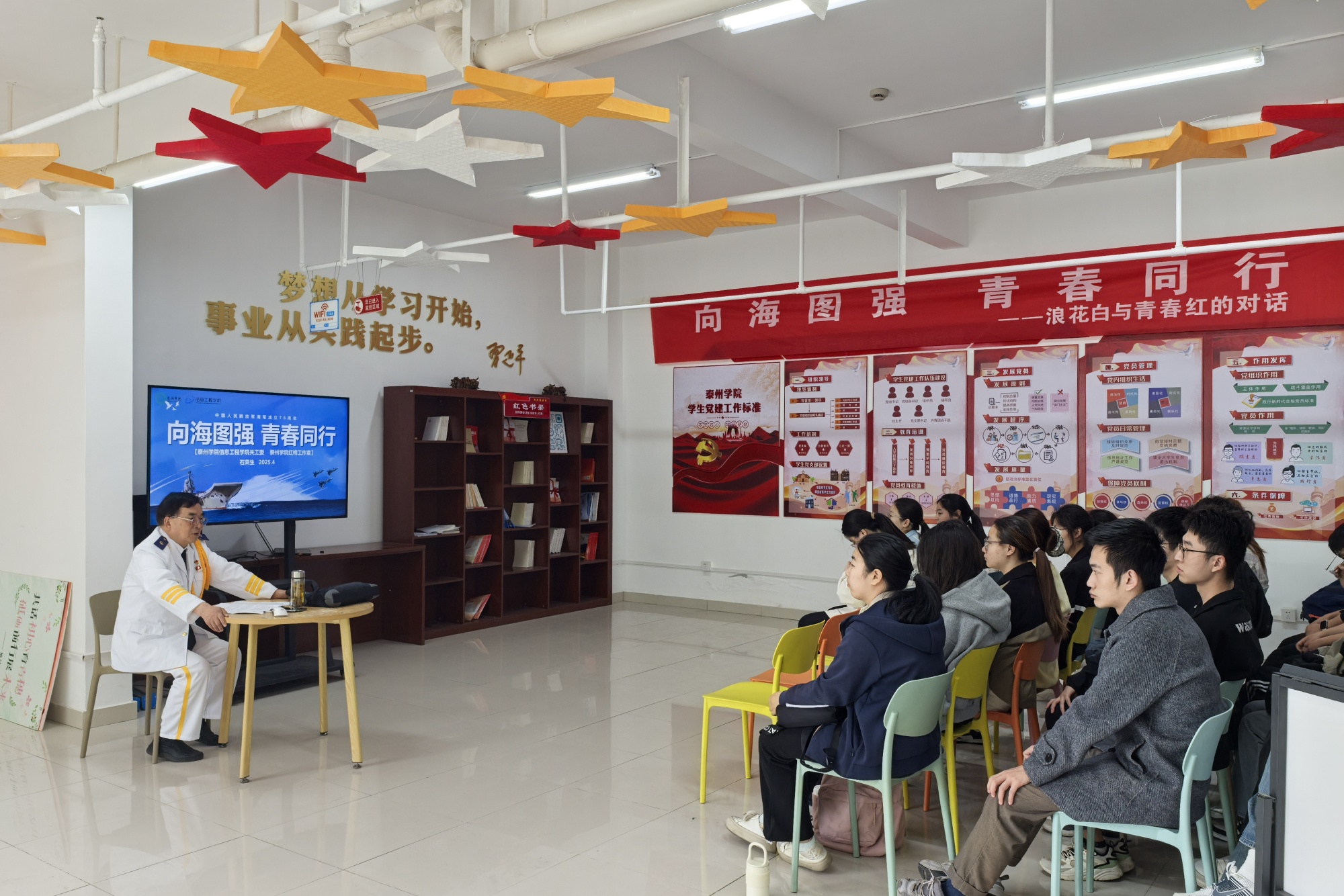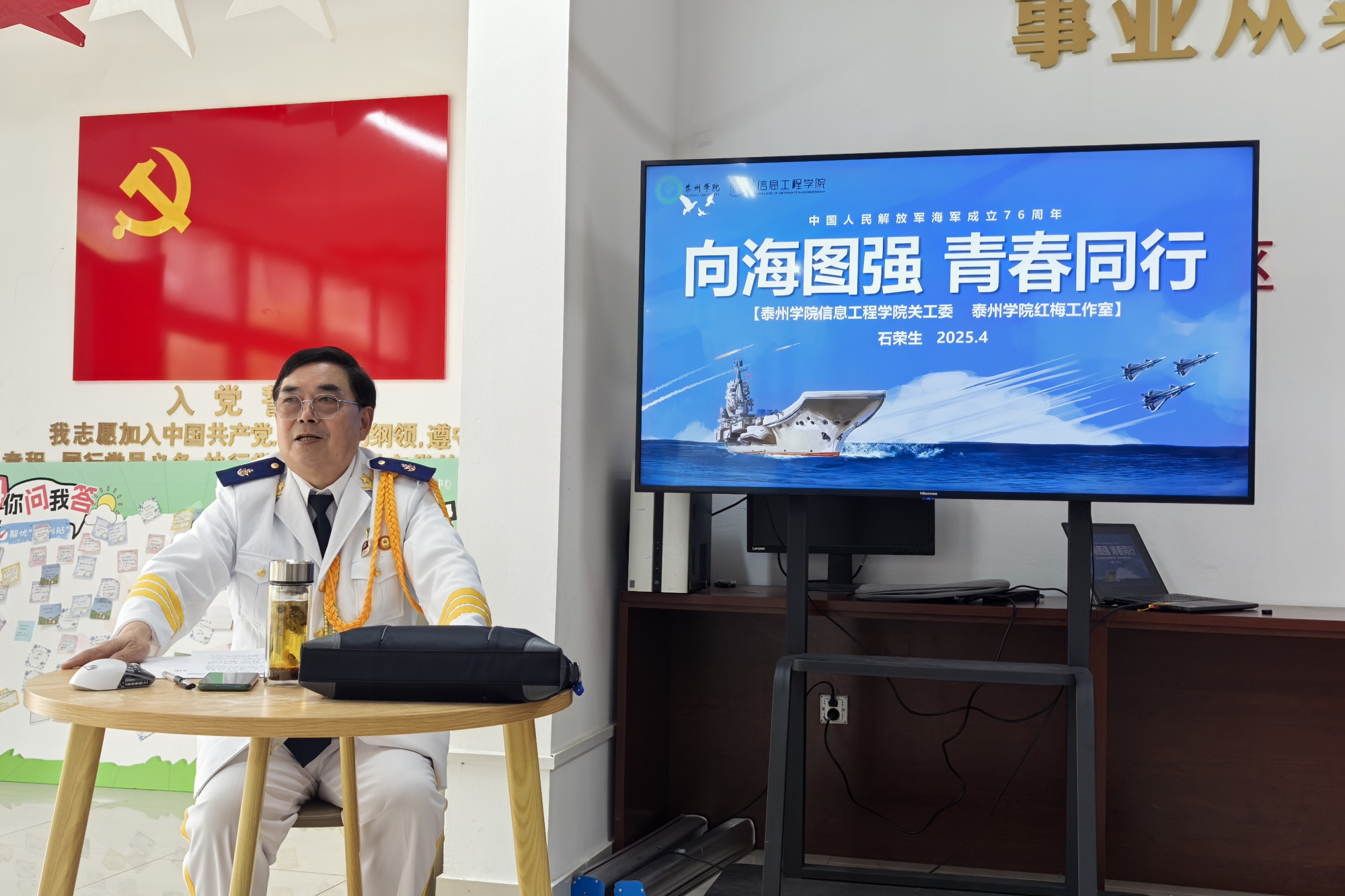 4月22日,为庆祝人民海军成立76周年,深化国防教育,伟德国际bevictor1946、红梅辅导员工作室在公司一站式服务中心举行“向海图强 青春同行”主题宣讲会。活动邀请服役16年的退役海军军官石荣生担任主讲。