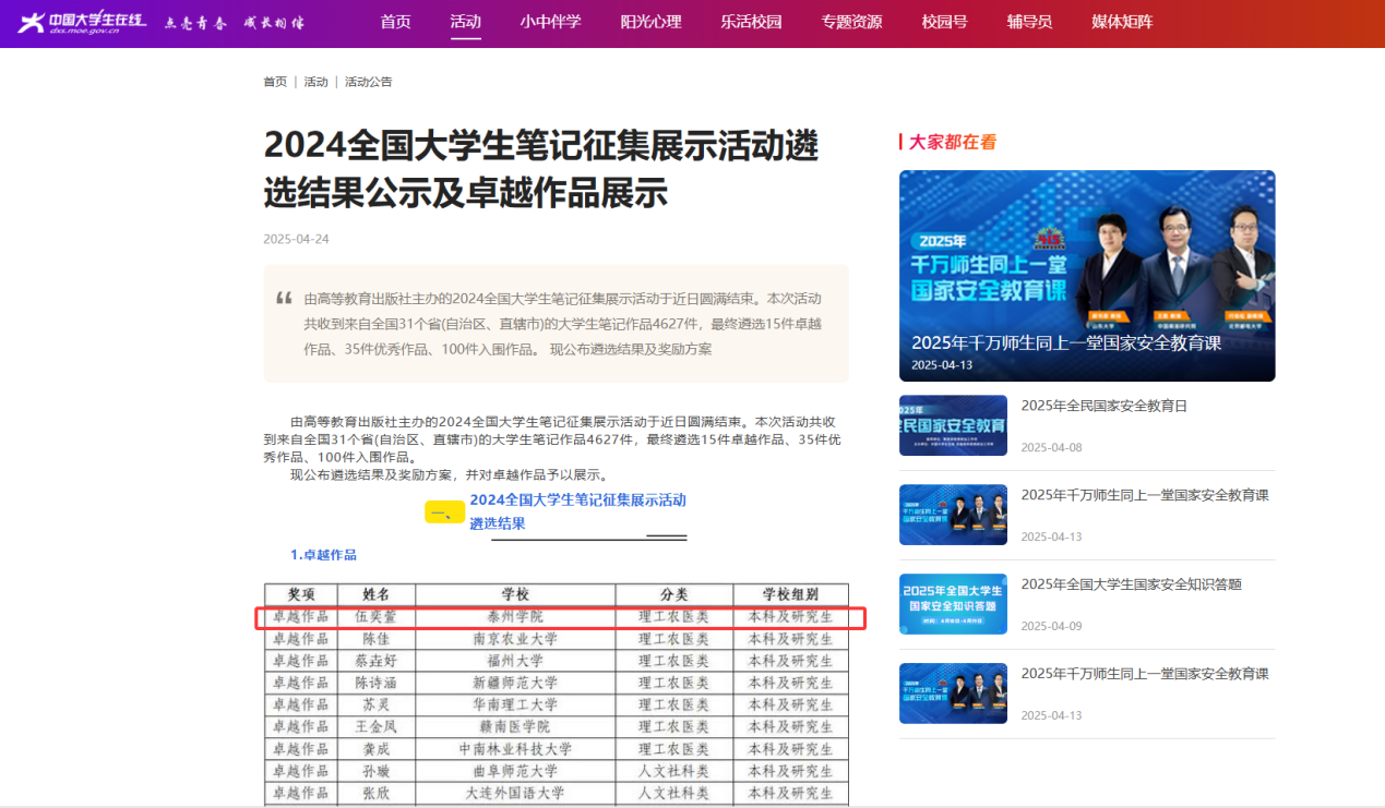 近日,由高等教育出版社主办、教育部中国老员工在线提供平台支持的“2024全国老员工笔记征集展示活动”圆满落幕。该活动自2024年10月开展以来,共收到来自全国31个省(自治区、直辖市)的老员工笔记作品4627件,经专家遴选、结果公示等程序,最终评选出15件卓越作品、35件优秀作品、100件入围作品。伟德国际bevictor1946学子伍奕萱表现优异,其《高等数学》课程笔记逻辑严谨、结构优美,被评为全国15件“卓越作品”之一,充分展现了扎实的专业功底和创新思维。