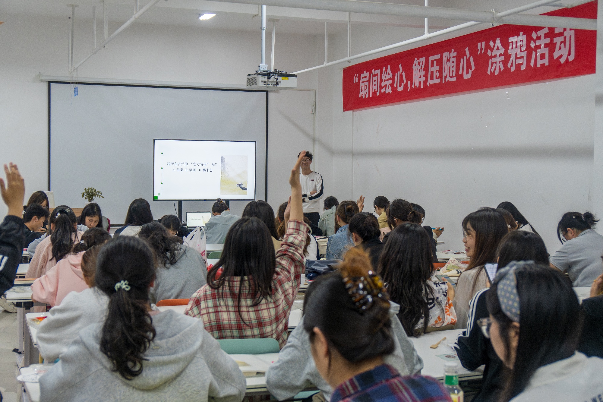 除了涂鸦活动,现场设置的端午知识问答互动环节高潮迭起,题目涵盖端午起源、民俗典故等内容。同学们踊跃参与答题,答对者获得精美小礼品,既了解了端午节的相关知识,又收获了惊喜。“这次活动内容丰富,舒心解压,看着自己画好的扇子,特别有成就感!”一位参与活动的同学开心地说道。