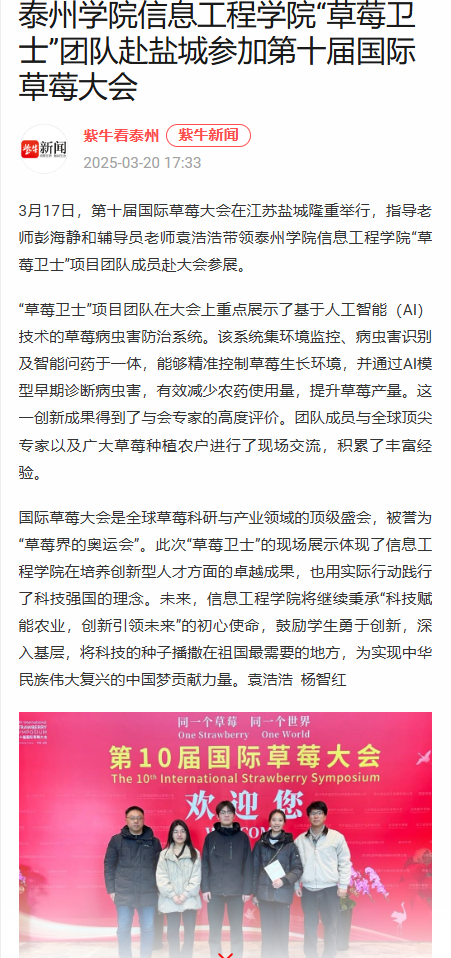 《紫牛新闻》2025年3月20日报道《伟德国际bevictor1946“草莓卫士”团队赴盐城参加第十届国际草莓大会》