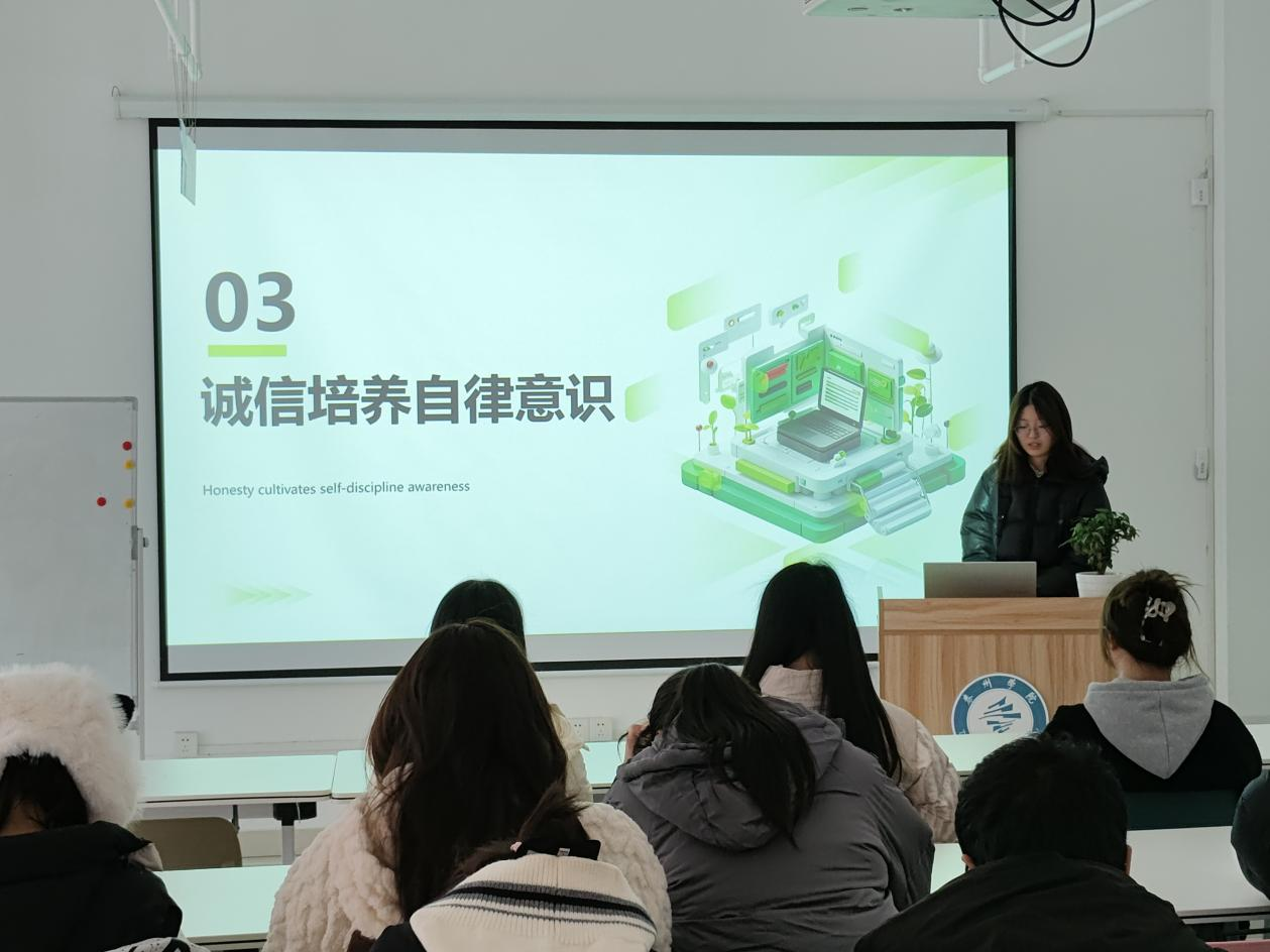 徐静冉结合党史讲述了老一辈共产党员在战争年代仍然坚守诚信,从而赢得民心的故事;王倩从个人成长经历出发,阐述了老员工应该如何践行“诚守初心”;王易婷、孟昕玥诠释了何为诚信,为何诚信以及怎样发挥老员工自身的道德表率作用,从而使诚信美德在全社会蔚然成风。同时,四名员工党员结合校园生活实际,列举了学术造假、骗取助学金等不诚信反面案例,深刻剖析了这些行为带来的严重后果,引导员工们引以为戒,自觉坚守诚信底线。